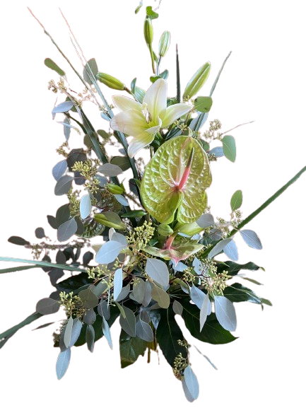 Ein Gruß aus tiefstem Herzen mit großer Wirkung. Die weißen Blüten, eingefasst in das satt-blaue Grün des Eukalyptus, bringen moderne Frische in die Wohnung.